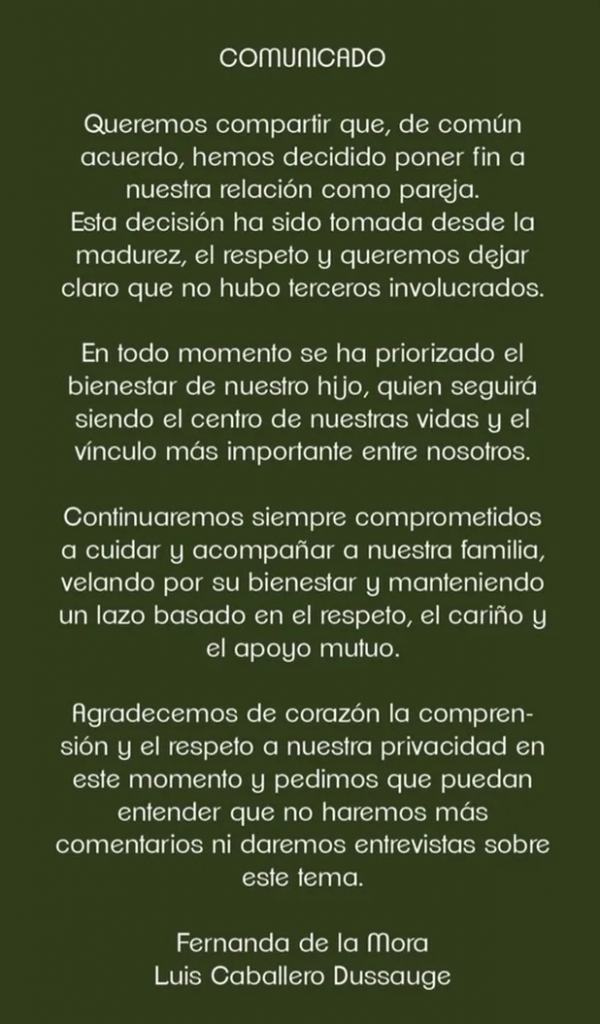 En el mensaje aseveró que la decisión la tomaron de común acuerdo, rechazando que existiera alguna infidelidad: “Hemos decidido poner fin a nuestra relación como pareja. Esta decisión ha sido tomada desde la madurez, el respeto y queremos dejar claro que no hubo terceros involucrados”, dice el mensaje.